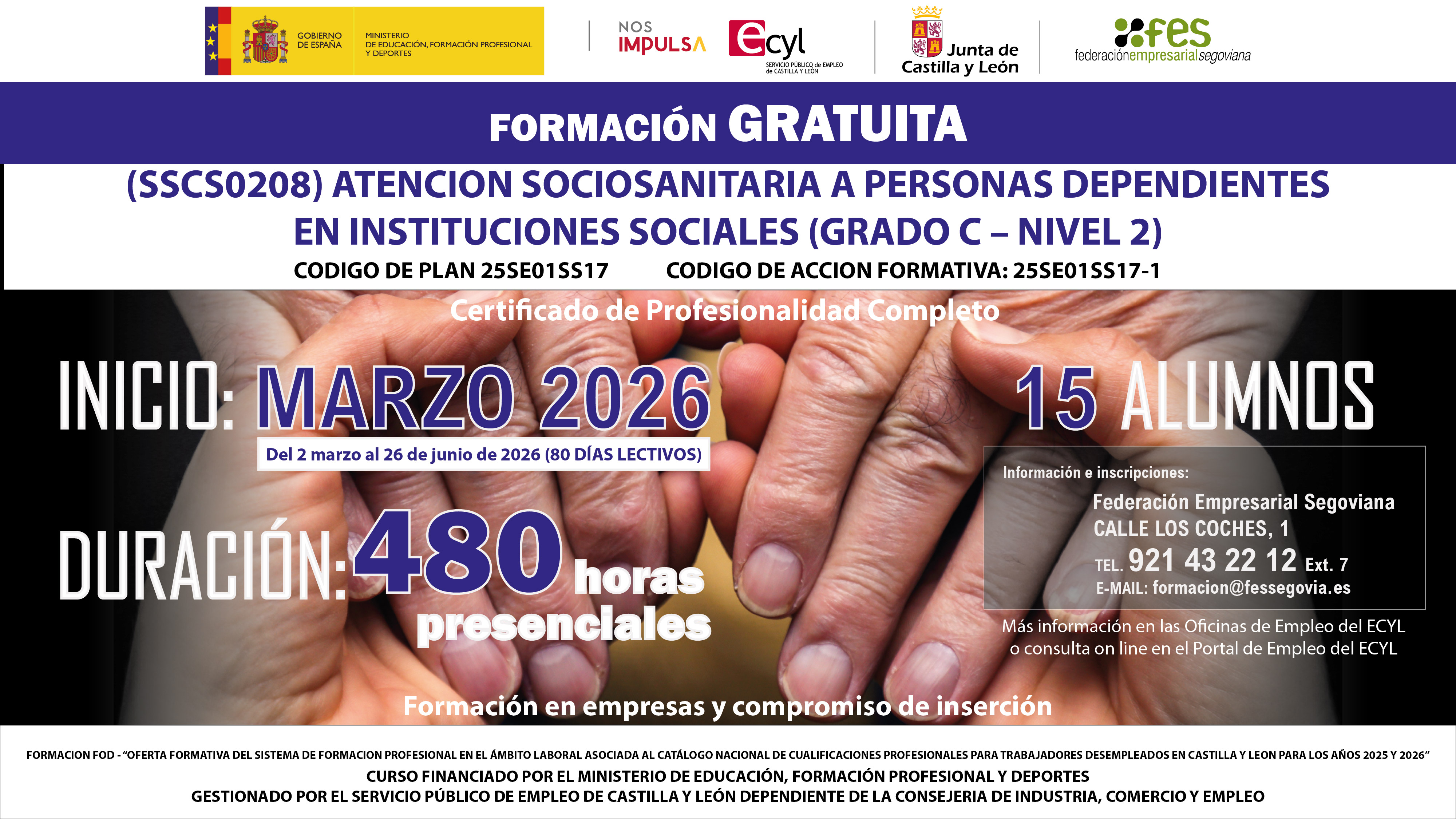 El próximo 2 de marzo de 2026 comenzará en Segovia el curso presencial de “Atención Sociosanitaria a Personas Dependientes en Instituciones Sociales”, con una duración de 480 horas, que permite obtener un Certificado de Profesionalidad completo (Grado C – Nivel 2).